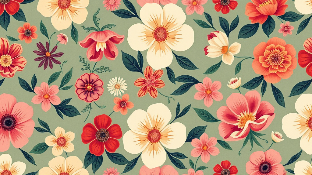 Vintage floral pattern featuring a harmonious blend of vibrant colors; a minimalist approach to design, capturing the essence of classic aesthetics with a modern twist; elongated elegance and balanced simplicity, evoking nostalgic charm.