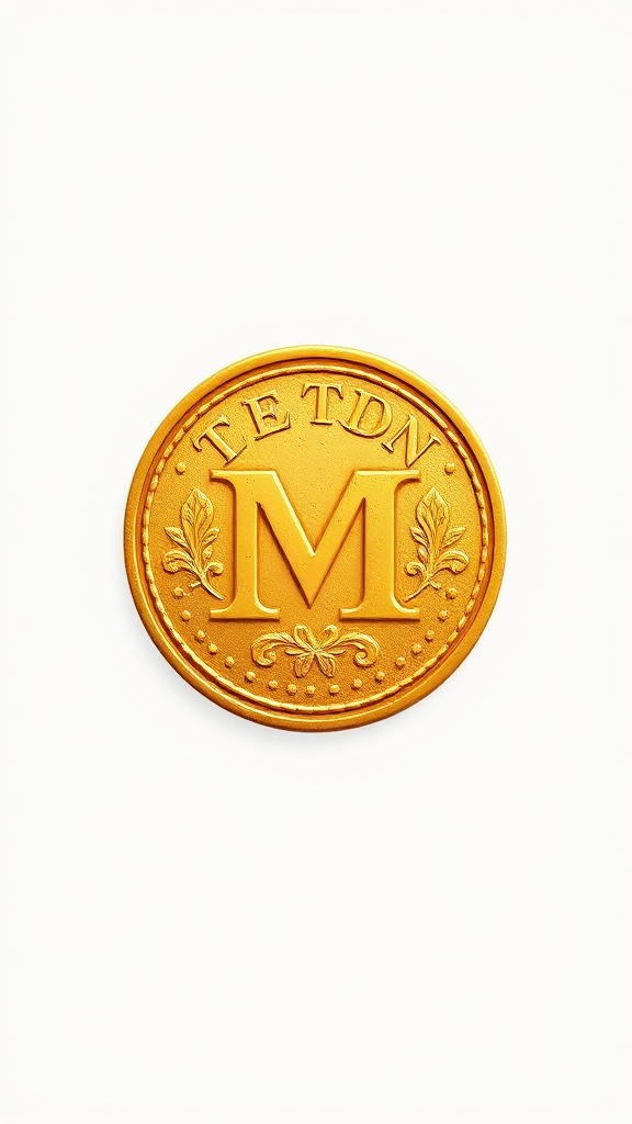 Vintage iconic logo featuring the letter M, designed on a coin, with a warm yellow color palette and delicate gradients, set against a pristine white background, incorporating subtle textures for a classic yet refined look.