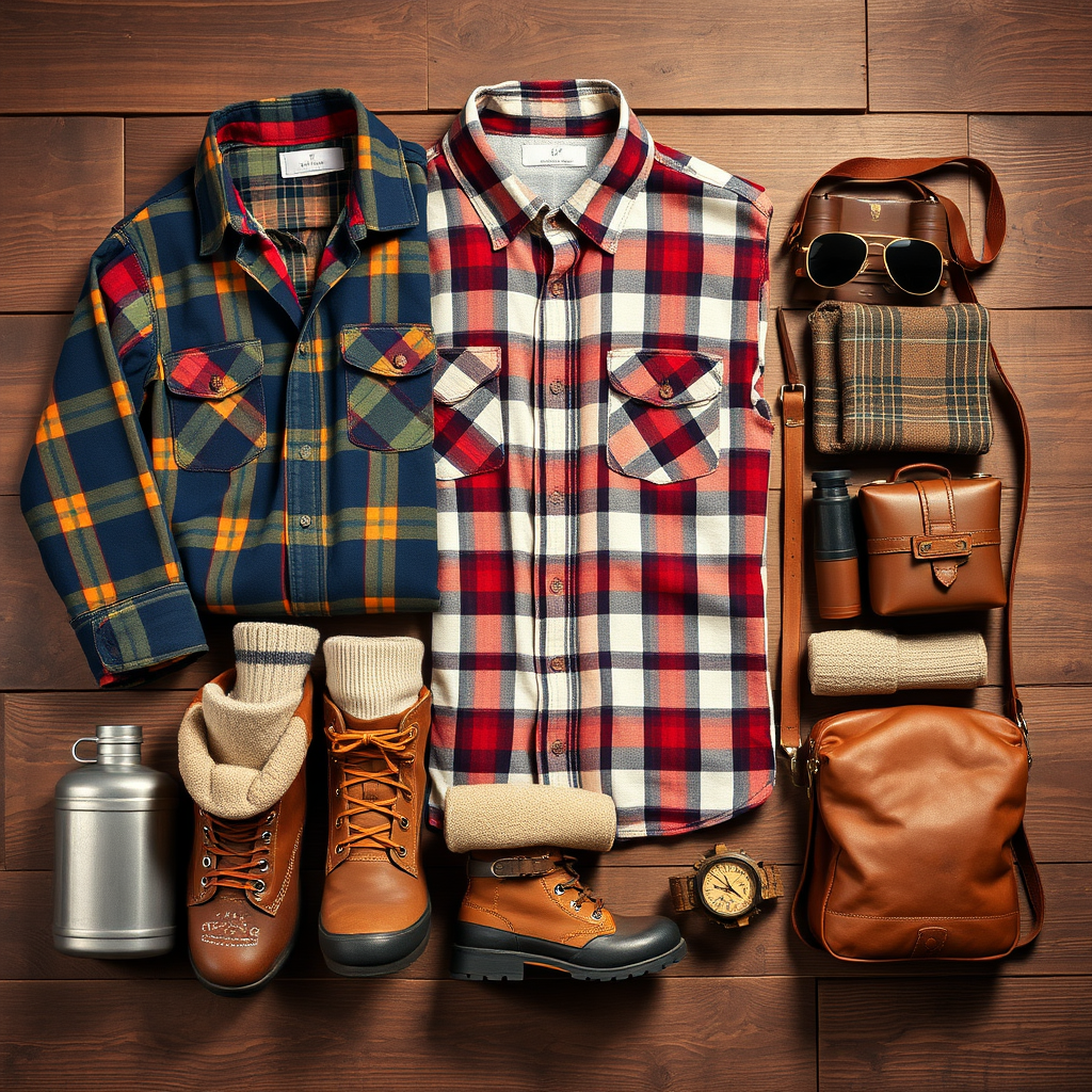 Vintage-inspired camping wear from the 1960s arranged in a meticulous knolling fashion, featuring a perfectly organized layout of retro plaid shirts, canvas hiking boots with leather accents, rolled-up wool socks, classic metal canteens, round sunglasses, and a leather-strapped compass, all set against a rustic wooden backdrop for a photorealistic depiction with subtle hints of modern creativity in color tones and texture details.