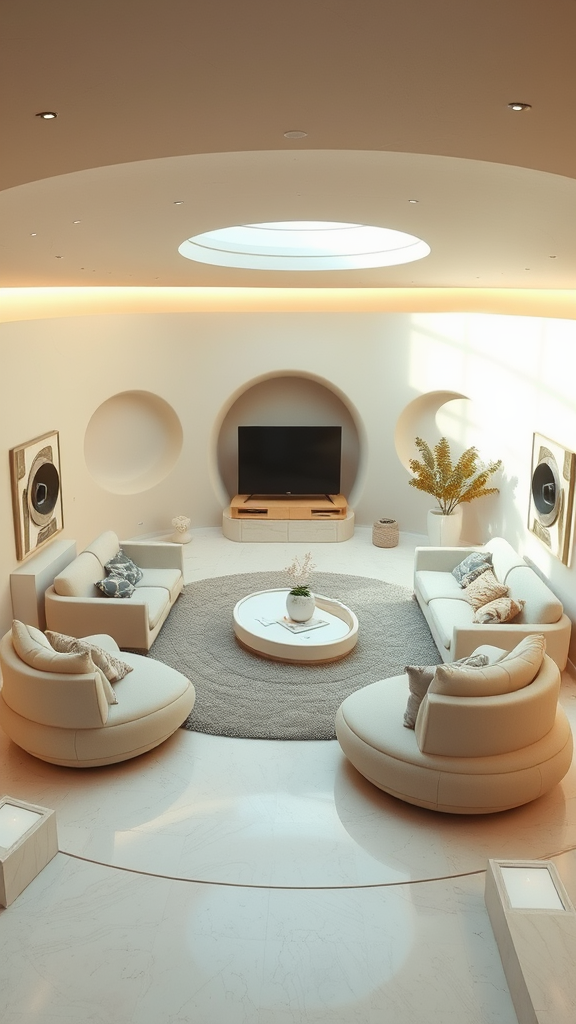Vintage-inspired conversation pit in a sunken living room, featuring retrofuturism interior design elements from the 1970s, imagined as a dreamy, high-resolution 3D architectural render. The space is adorned in a soothing palette of neutral beige tones, blending nostalgic charm with a futuristic twist. Sculptural furnishings and smooth, flowing lines create an inviting ambiance, enhanced by subtle lighting that casts gentle shadows across the room's contours. Comfortable seating encircles a central, minimalistic coffee table, surrounded by soft textures and retro decorative accents, completing the vision of a timelessly elegant retreat.