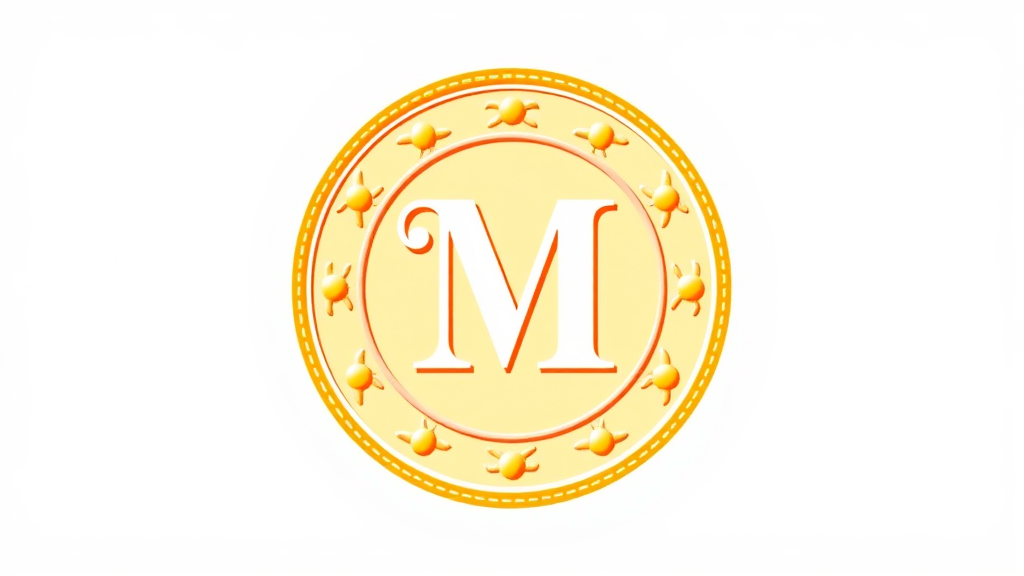 Vintage inspired emblem featuring the letter M prominently centered on a coin, utilizing a warm yellow color palette with delicate gradient transitions, set against a clean white background, incorporating subtle artistic embellishments for a classic yet timeless appeal.