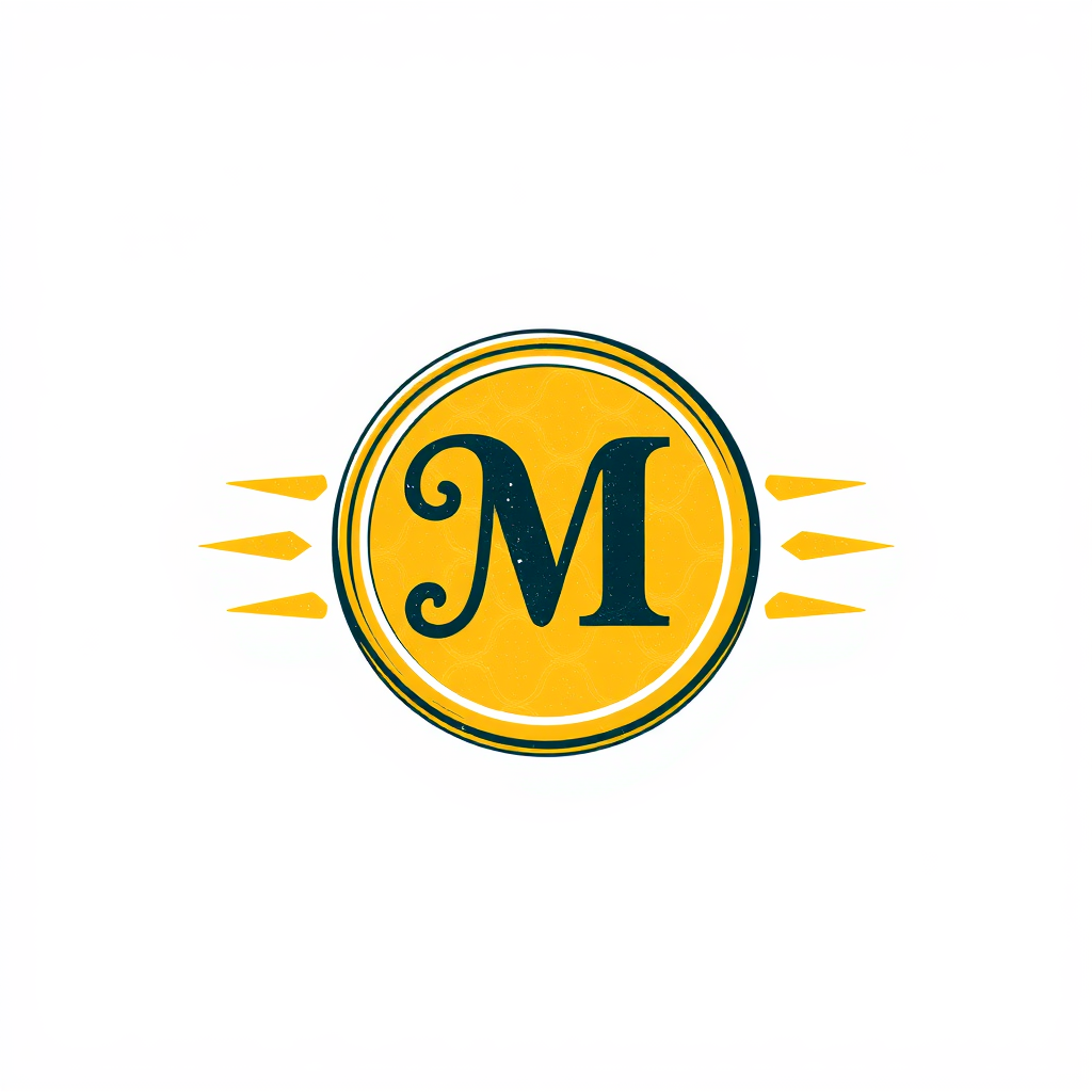 Vintage-inspired logo featuring an iconic "M" on a coin, utilizing a warm yellow color palette with gentle gradients, set against a clean white background, incorporating subtle textures for a classic touch.