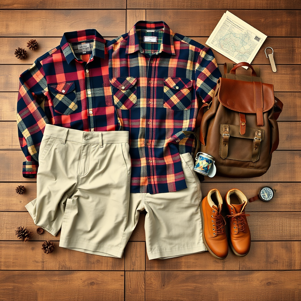 Vintage-inspired scene featuring meticulously arranged 1960s style camping attire, each item neatly laid out on a weathered wooden surface. Classic pieces like plaid flannel shirts, high-waisted khaki shorts, and canvas hiking boots are complemented by retro accessories such as a worn leather backpack, a thermos with a bold geometric pattern, and a vintage compass. The warm tones and rich textures create a nostalgic outdoorsy vibe, with scattered pine cones and a folded map adding a touch of adventure to the composition. The overall presentation captures the essence of organized preparation for a classic camping experience, emphasizing the timeless appeal of mid-century outdoor gear.