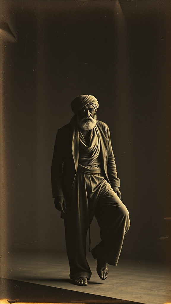 Vintage photograph of a turbaned Indian man, legs elevated, capturing disfigured silhouettes in the essence of contemporary Middle Eastern and North African art between 1860–1969, exhibiting a brooding atmosphere. Composition is sparse and minimalistic, resembling photographic tapestries with a crumpled texture, aspect ratio 3:4.