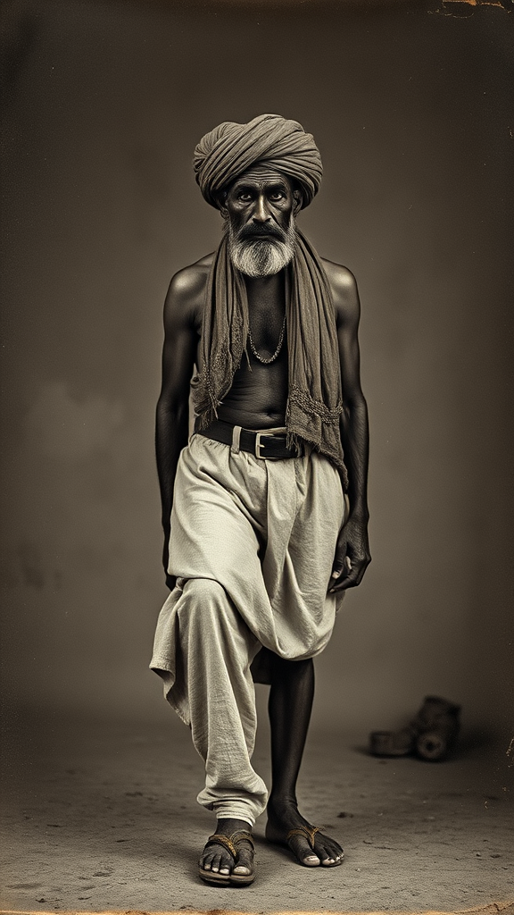 Vintage photograph of an Indian man in a turban with his legs slightly elevated, evoking disfigured forms and influenced by contemporary Middle Eastern and North African art spanning from 1860 to 1969, presenting a brooding atmosphere with minimalist elements, intricate photo-textile blends, and a weathered texture, aspect ratio 3:4, high stylistic complexity.