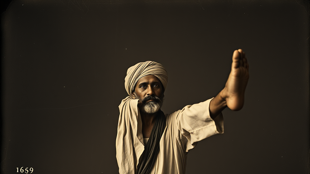 Vintage photograph of an Indian man in a turban with his legs elevated, styled with distorted figures, modern Middle Eastern and North African art influences, capturing the era from 1860 to 1969, moody and introspective, minimalistic and clean, woven photographic textures, creased, aspect ratio 3:4, with subtle artistic twists.