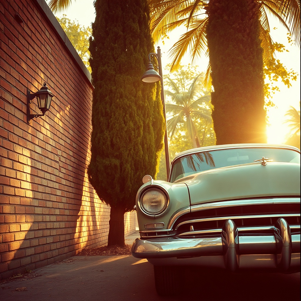 A vibrant vintage scene featuring an old classic car parked against a weathered brick wall, reminiscent of the 90s, with a subtle grain as if captured on 35mm film. Sunlight casts a warm, nostalgic glow, highlighting the shiny chrome details and faded paintwork of the car. Tall, lush trees form the backdrop, their leaves gently rustling in the breeze, creating a serene and timeless atmosphere. A distant streetlamp flickers to life as if frozen in a perpetual golden hour, adding to the scene's authentic retro charm.