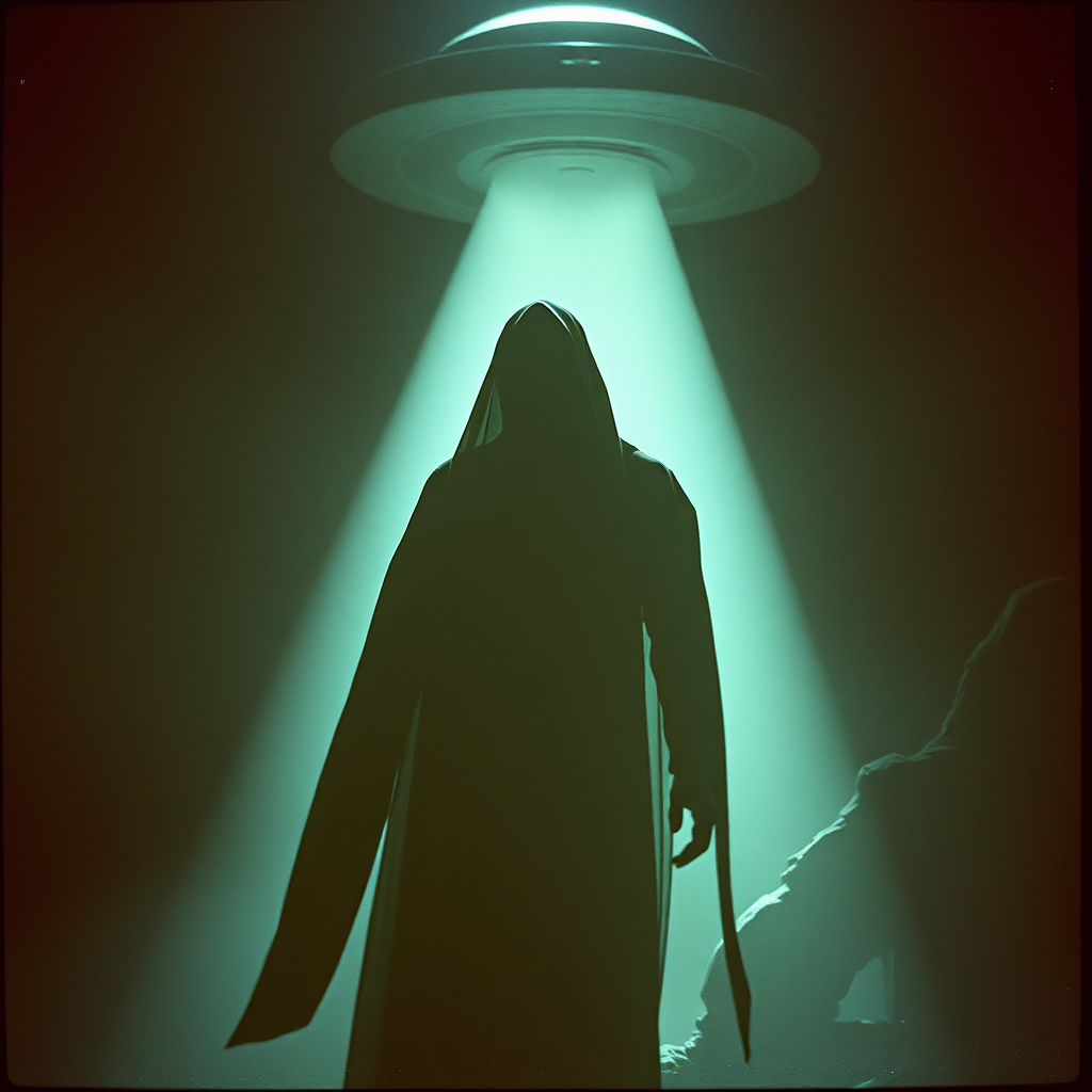 Vintage sci-fi scene reminiscent of a 1988 film featuring a live action depiction of a mysterious futuristic ghostly figure, shrouded entirely in shadow, set against a backdrop hinting at a UFO encounter. The image captures a sense of timelessness and a quest for knowledge, characterized by authentic 35mm film grain. Shot using a Hasselblad H6D-100c camera with an XCD 85mm f/1.8 lens, the composition is infused with an air of unpredictability and raw artistry, along with a distinctive style marked by storied adventurousness. The atmosphere conveys both mystery and discovery, embodying the spirit of cinematic exploration and creativity.