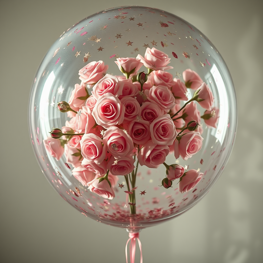 Vintage-style photograph capturing an enormous translucent balloon filled with blossoming roses and shimmering confetti, showcasing intricate details in ultra-high resolution, portraying hyper-realism with an aspect ratio of 3:4, surrounded by a soft, diffused light casting gentle shadows.