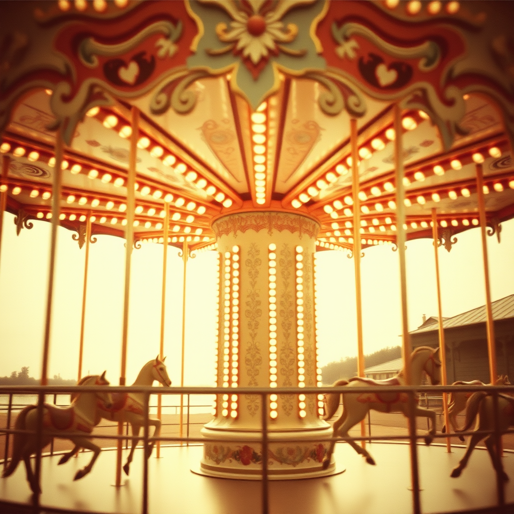 Vintage-style photograph of a carousel, evoking a dreamy and nostalgic feel, with a soft, modern aesthetic and minimalist composition, high resolution, warm tones, --aspect ratio 4:3.
