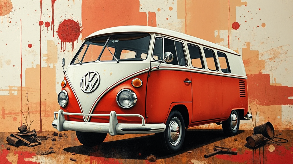 Vintage VW bus with a charming character illustration amidst abstract canvas art, capturing the essence of rusty debris and light red and brown hues. The artwork echoes the intricate style of Brian Mashburn, infused with the imaginative touch of Theo Prins and the classic elegance of Pierre Pellegrini. This nostalgic piece embraces a unique cut-and-paste aesthetic, celebrating a blend of modern whimsy and vintage charm.