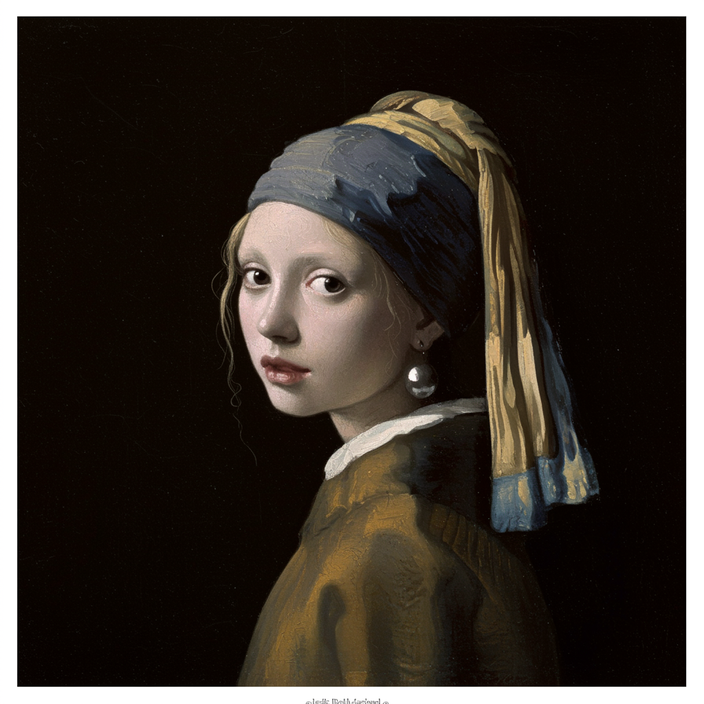 A haunting vision of "Girl with a Pearl Earring" reimagined as a Gothic masterpiece, featuring a blond-haired girl with a mysterious air. She wears a black headscarf that contrasts sharply with her pale, ethereal complexion. This detailed oil painting serves as a striking background, blending the emotional depth of Gothic art with the refined elegance of the Dutch Golden Age. The composition, crafted by an award-winning contemporary artist, evokes an enigmatic mood while paying homage to classic artistry.