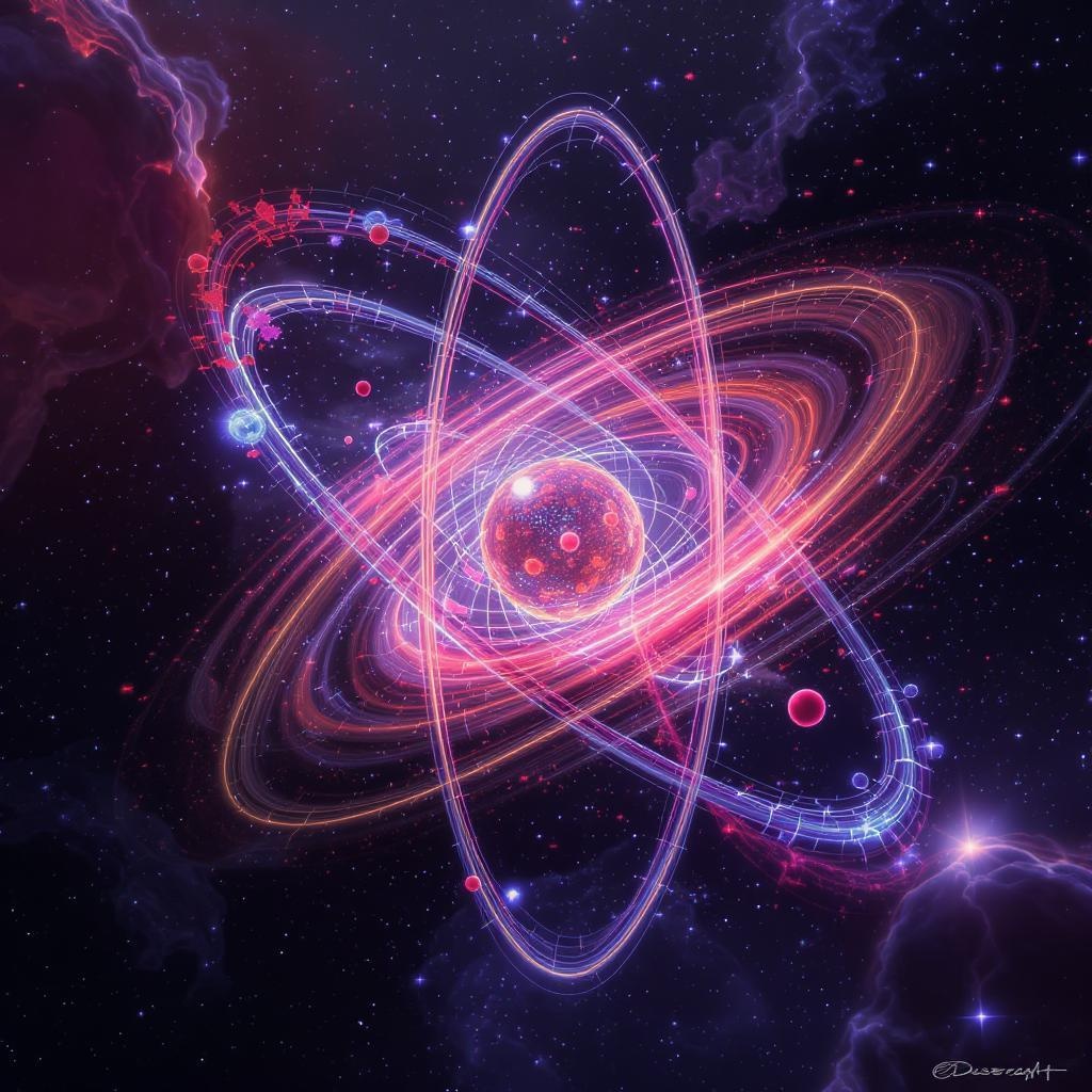 View this AI-generated image featuring an awe inspiring vision of an atom with a powerful nucleus of protons and neutrons surrounded by a magnificent swirl of electrons this futuristic masterpiece is captured in dramatic cinematic color the composition is strikingly professional with intricate detai