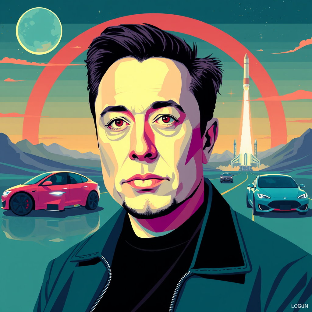 Visionary Elon Musk depicted in a vibrant SAI Pixel Art style, set against a futuristic landscape with sleek electric cars and a launching rocket in the background, blending surreal elements and crisp geometric patterns for a dynamic and innovative atmosphere.