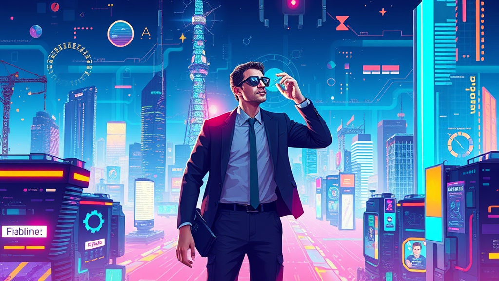Visionary entrepreneur in a futuristic cityscape made of vibrant pixel art, blending cybernetic elements with dynamic colors and abstract shapes, capturing the essence of technological innovation.