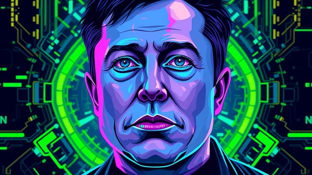 Visionary tech entrepreneur Elon Musk rendered in vibrant SAI pixel art style, featuring intricate details of his iconic facial expression and futuristic elements, cybernetically enhanced with electric blue and neon green hues reflecting his innovation-driven persona against a backdrop of abstract technology-inspired patterns.
