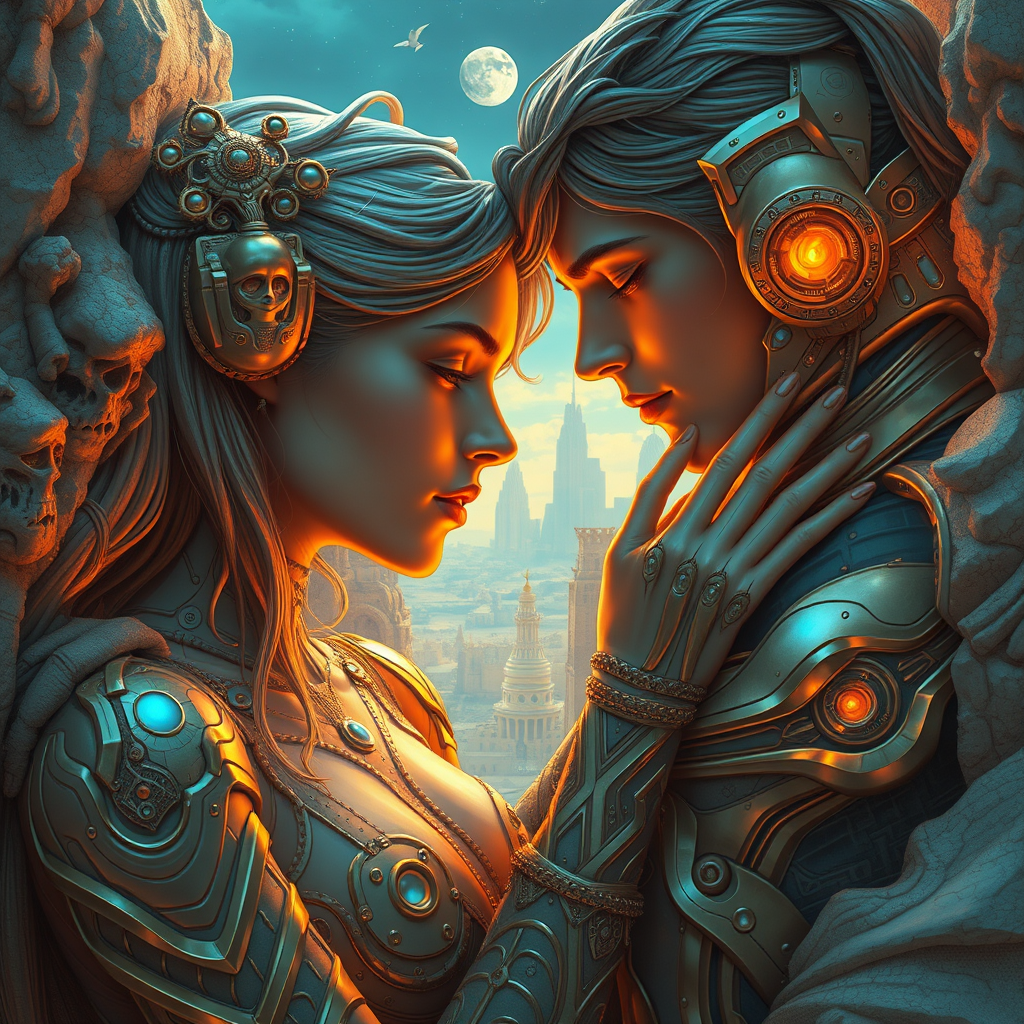 Visual artist Christiano V inspired by Franciszek Starowieyski, blending gold and cyan hues, creates hyper-realistic sci-fi illustrations. His work captures romantic fantasy themes using organic sculpting techniques. Drawing influences from Android Jones, the visuals explore surreal, otherworldly landscapes, featuring intricate details and ethereal elements, where love stories unfold amid futuristic settings. These artworks embody an emotional depth, harmonizing human and technological aesthetics in a unique narrative style.