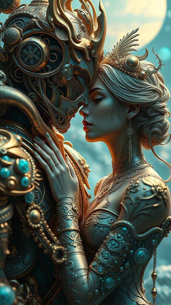 Visual fiction by Christiano V, inspired by Franciszek Starowieyski, highlighting gold and cyan hues in hyper-realistic sci-fi and romantic illustrations. Incorporates organic sculpting and the influence of Android Jones, presenting a romantic fantasy scene, with intricate and imaginative design elements blending the futuristic with the fantastical. Art aspect ratio is 32:31, with a subtle touch of surreal elegance.