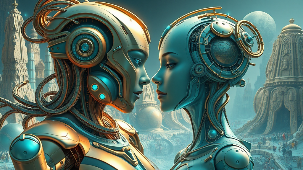 Visual fiction by Christiano V, inspired by the style of Franciszek Starowieyski, featuring a palette of gold and cyan, in hyper-realistic sci-fi romantic illustrations. The scene combines organic sculpting and the visionary touch of Android Jones, evoking a sense of romantic fantasy where futuristic elements seamlessly blend with classical art forms. The composition creatively weaves elements of advanced technology and ethereal beauty, exploring the harmony between human and machine in an otherworldly landscape, maintaining an aspect ratio of 32:31 with a heightened sense of surrealism and vibrant emotion.