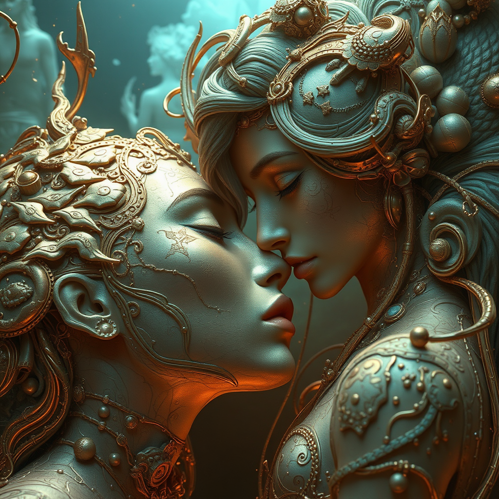 Visual fiction by illustrator Christiano V, inspired by Franciszek Starowieyski, featuring gold and cyan tones, hyper-realistic sci-fi visuals, romantic illustrations blending organic sculpting techniques. Emphasizing a romantic fantasy narrative, akin to the stylings of Android Jones, the artwork captures an ethereal blend of intricate details and emotive storytelling within a dreamlike setting.