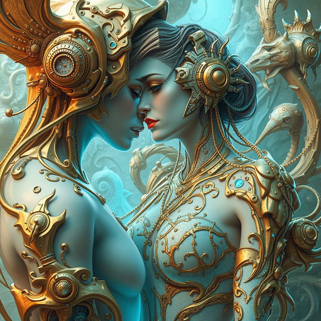 Visual fiction inspired by the artistry of Christiano V and the aesthetic of Franciszek Starowieyski, featuring gold and cyan hues. Hyper-realistic sci-fi elements blend with romantic fantasy in illustrations that showcase organic sculpting with a touch of Android Jones' surrealism. This artistic vision captures intricate details, melding romantic and futuristic themes in an imaginative exploration that balances human emotion with otherworldly atmosphere, maintaining a delicate balance between organic and mechanical forms.