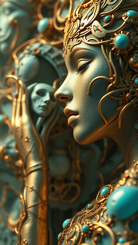Visual fiction, inspired by the work of Christiano V, capturing the essence of Franciszek Starowieyski. Rich in gold and cyan hues, it presents hyper-realistic sci-fi with a romantic twist. Brimming with organic sculpting influences akin to Android Jones, the romantic fantasy elements are intricately woven throughout the scene, blurring the lines between reality and dreams. The artwork exudes a captivating depth, showcasing surreal yet familiar worlds, where love and imagination intertwine seamlessly, inviting viewers into a realm of enchanting possibilities.