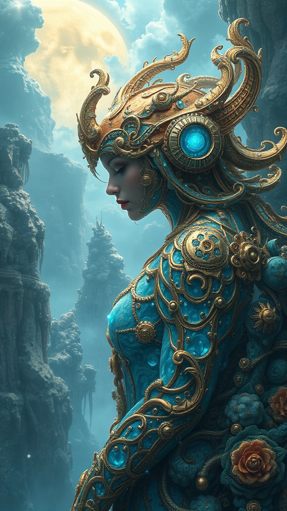 visual fiction, visual artist, christiano v, in the style of franciszek starowieyski, shimmering gold and vibrant cyan, hyper-realistic sci-fi, romantic illustrations, organic sculpting, reminiscent of android jones, enchanting romantic fantasy, intricate details and ethereal landscapes, elegant fusion of technology and nature, dreamlike aura, surrealism intertwined with realism, --ar 32:31 --s 750 --v 5.2