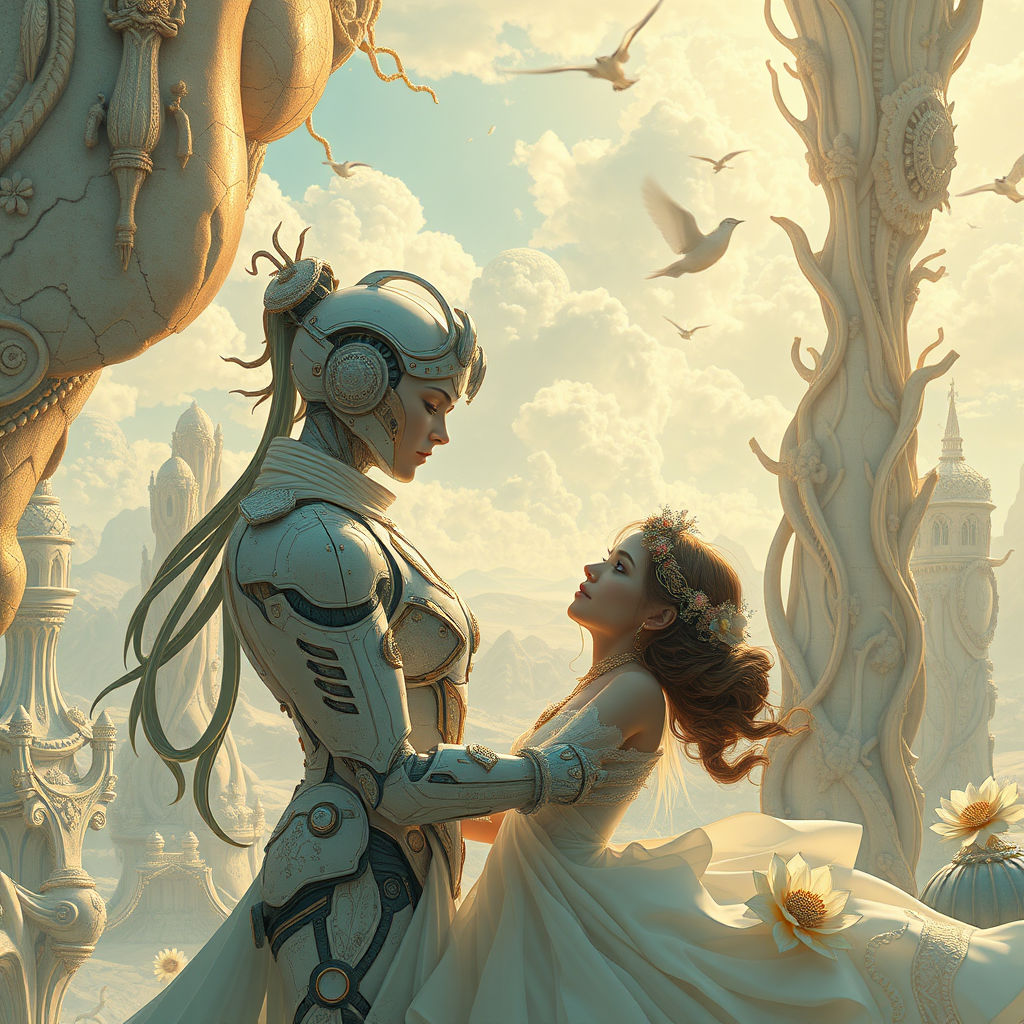 Visual storytelling by illustrator Christiano V, inspired by the style of Franciszek Starowieyski; featuring a palette of gold and cyan with hyper-realistic sci-fi elements. Romantic illustrations blend with organic sculpting, reminiscent of Android Jones' work, to create a romantic fantasy atmosphere. Set in an art ratio of 32:31, the scene captures a surreal interplay of emotion and technology, where futuristic landscapes meet whimsical narratives.