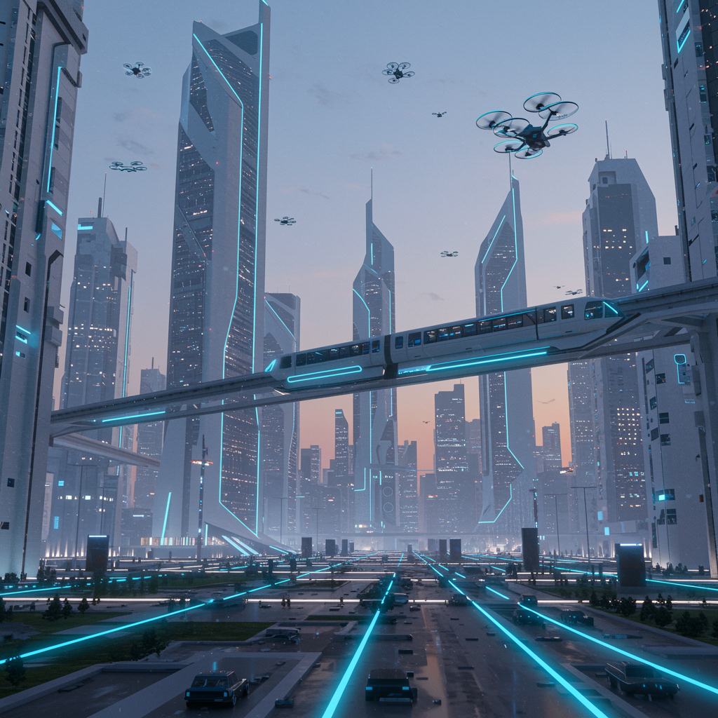 Visualize a futuristic cityscape centered around streamlined skyscrapers, each with a luminous glow against a twilight sky. The skyline is interconnected with sleek, suspended monorails and aerial drones softly buzzing overhead. The architecture reflects clean, geometric lines and minimalist forms, exuding a sense of advanced technology. The color palette is minimalistic, blending shades of steel gray and crisp whites with pops of neon blue and silver accents. A subtle luminescence emanates from street-level pathways, guiding autonomous vehicles through the meticulously organized grid below.