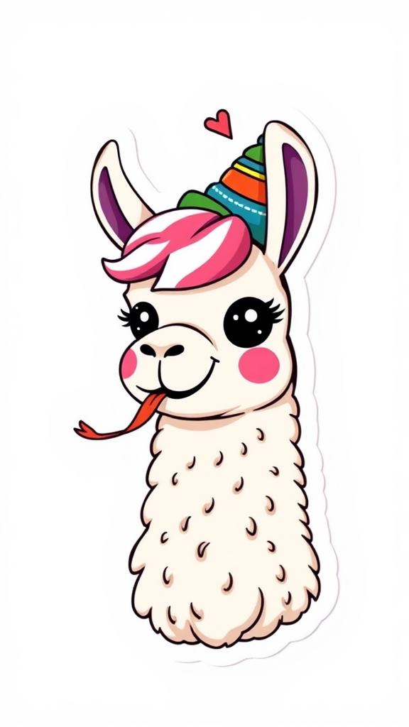 Visualize a whimsical and charming llama, radiating playfulness and joy. This delightful creature is depicted with a cheeky grin and a humorous twist, like a tongue playfully poking out or a quirky, colorful hat perched atop its head. Vibrant hues and energetic lines illustrate its lively spirit, crafting an enchanting and endearing design perfect for a sticker. The artwork is rendered in a vector style with bold contours against a clean white background, keeping the focus on the llama's captivating and dynamic presence.