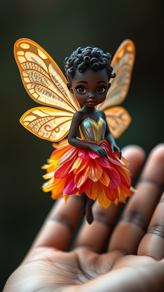 Visualize an ultra-high definition, intricately detailed full body portrait of a miniature, anthropomorphic fairy girl, a charming magical creature exuding enchanting elegance and grace. She embodies a captivating blend of the familiar and the fantastical. This petite fairy, a celebration of African beauty, has rich, dark skin that radiates a warm, iridescent glow, accentuating her delicate features. Her eyes shine with lively curiosity and youthful energy, mirroring the playful curls of her short, black hair that seem to defy gravity. She wears a dress crafted from the most vibrant and colorful flower petals, the unique garment clinging gently to her petite form, enhancing her spirited personality. Her most striking feature, her glimmering wings, unfurl from her back, capturing the light with each flutter. They resemble dragonfly wings, a mosaic of luminescent colors, delicate yet powerful, hinting at her ability to transcend the human world and enter the realm of enchantment. She perches with confidence in a human hand. The realistic depiction of the hand contrasts with her fantastical presence, showcasing a myriad of textures from the fine lines of the skin to the smoothness of the nails, the size contrast further highlighting the fairy’s petite allure. Despite the size difference, the interaction is harmonious, suggesting a magical connection between the human and fairy worlds. Her gaze meets the viewer’s, carrying a silent conversation, a secret shared between the magical and human realms. The viewer is left with an impression of an encounter that blurs the line between reality and fantasy, a moment frozen in time where anything feels possible.