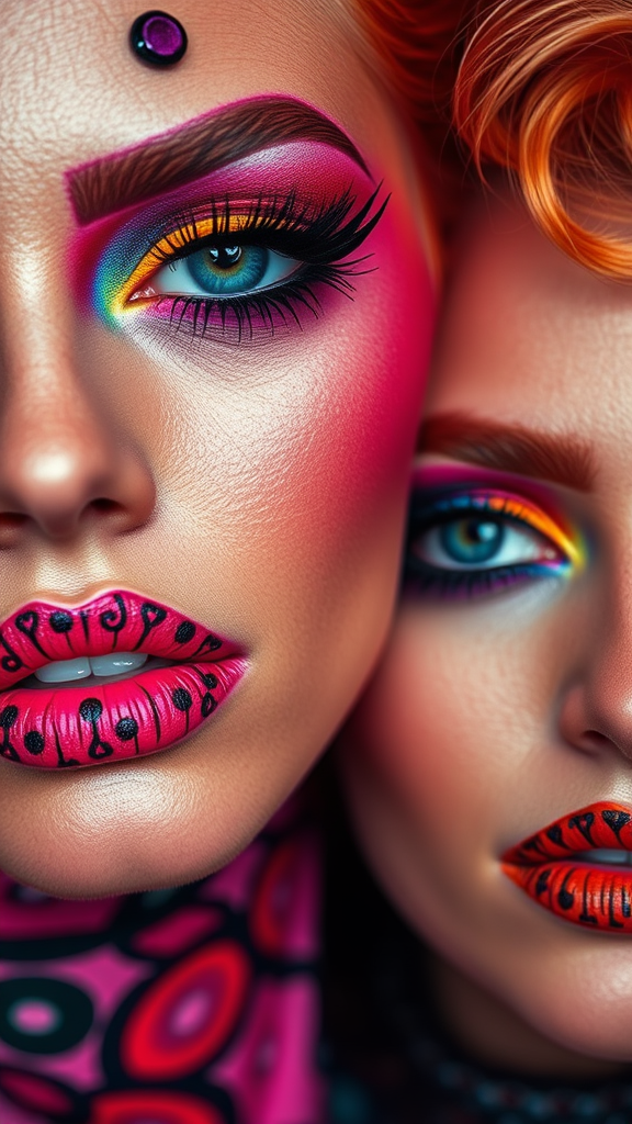 Vivid and daring makeup artistry featuring colorful eyeshadows and striking lip colors, adorned with imaginative patterns; Portraits of women capturing unique expressions; Emphasizing the rule of thirds for composition; Energetic and dynamic style, embracing a wild and creative spirit.