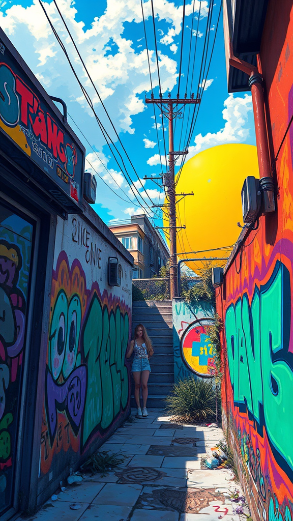 Vivid anime painting of a solarpunk summer day, inspired by the styles of Tim Okamura, Victor Nizovtsev, Greg Rutkowski, and Noah Bradley. Masterpiece quality trending on ArtStation, with 8k fine detail and vibrant colors. The scene is marked by intricate, colorful graffiti art, and a harmonious golden ratio composition. Creative imperfections subtly weave into the artwork, suggesting an abstract expression rather than literal accuracy, incorporating imaginative and whimsical elements. The composition maintains a dreamlike quality with softly blurred edges for a captivating, ethereal effect.