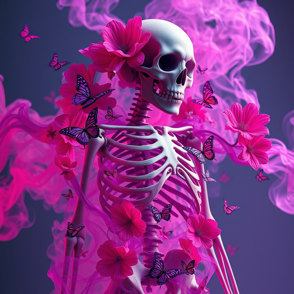 Vivid blossoms in a DMT-inspired style, 3D rendered, a skeleton intertwines with 'Fluid Fragments', seamlessly morphing through an array of abstract crimson and violet compositions, each transition defying conventional boundaries, rendered in ultra-realistic detail using Unreal Engine 5, evoking the scent of earth and decay, intertwined with shattered bone, butterflies, and swirling smoke.