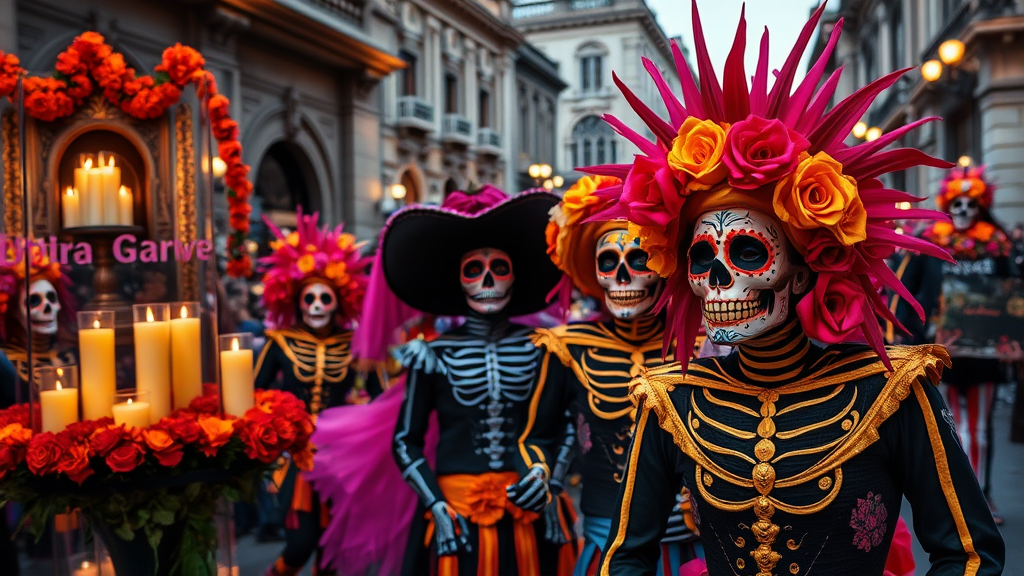 Vivid celebration of the Día de los Muertos Parade in Mexico City, captured in high-resolution photography, ultra-realistic details showcasing vibrant costumes and intricate sugar skull face paint, lively atmosphere with marigold-adorned altars and flickering candlelights, capturing the essence of cultural tradition and lively spirits amidst a backdrop of historic architecture, --aspect ratio 1:2 --stylize 750 --version 6.1