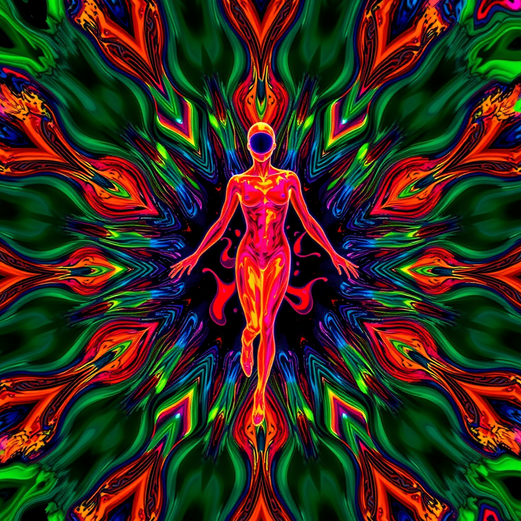Vivid kaleidoscopic liquid artwork featuring a neon-infused figure, swirling with vibrant hues of emerald green, cobalt blue, deep ruby red, fiery orange, sunny yellow, and bright pink, intricately detailed and captivating.