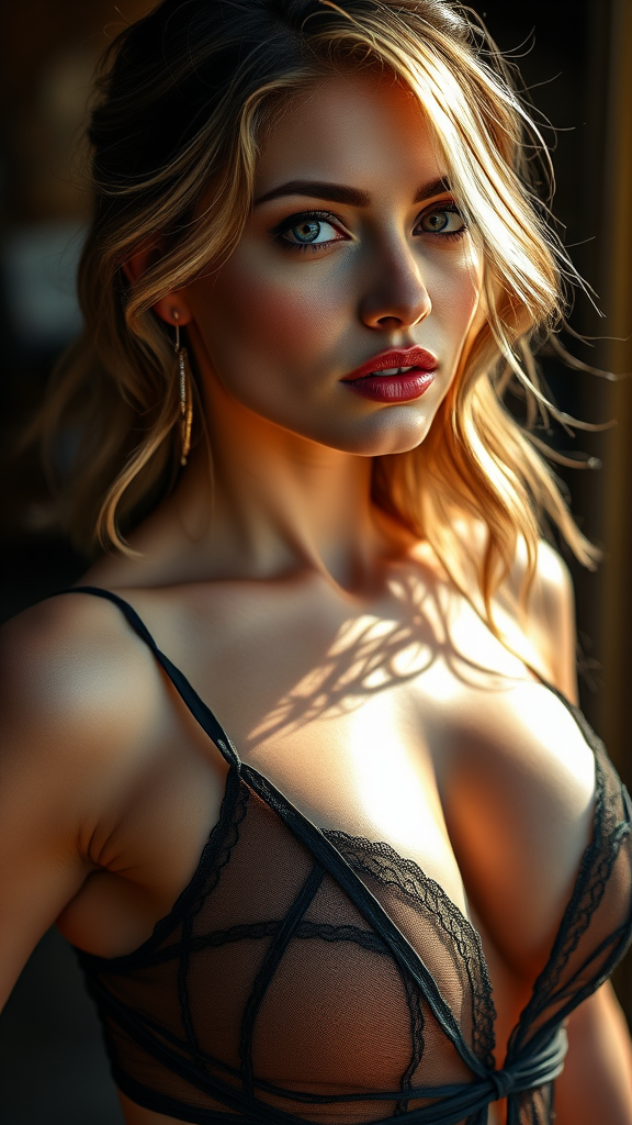 Vivid portrait of a confident woman in an ultra-provocative micro dress, playfully engaging; Professional Macro Photography showcasing intricate, intense close-up, with crisp clarity, natural daylight illuminating her features; Captured using Canon EOS 5D Mark IV DSLR, f/8 aperture, 1/250 second shutter speed, ISO 100; High-resolution, award-winning quality, enhancing every detail; By Artificial Nightmares; Subtle enhancements to create radiance with blurred background, atmospheric depth, vibrant and impressive without losing focus.