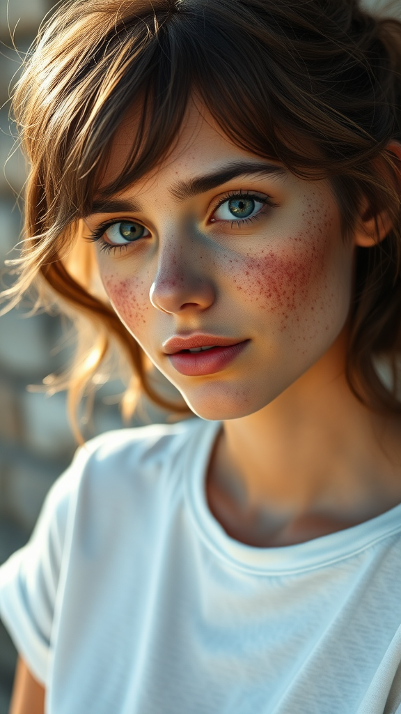 Vivid portrait of a freckled woman with round eyes and slightly tousled hair, captured outdoors in a soft white t-shirt. Her skin's natural texture and slightly chapped lips are highlighted under gentle natural light. A magical, ultra-detailed composition emphasizes photorealism, using an 85mm lens with dramatic lighting reminiscent of cinematic Cinestill 800T aesthetics, infusing a dreamy yet authentic feel.
