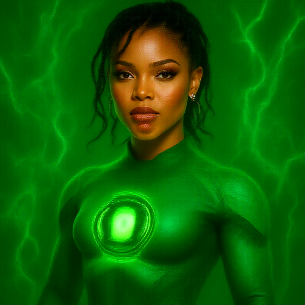 "Vivid portrait of Rihanna reimagined as Green Lantern, youthful and dynamic, exceptionally detailed with hyperrealistic features, Ultra HD clarity, imaginative elements subtly incorporated into her attire and background, showcasing a fusion of elegance and power."