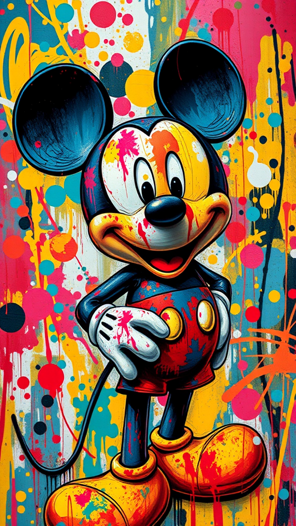 Vivid reimagining of Mickey Mouse with expressive abstraction, surrounded by an exuberant, Jackson Pollock-inspired backdrop; a full, immersive canvas bursting with vibrant color. Featured as a high art centerpiece in a MoMA magazine, on par with prestigious, wild, and emotive masterpieces. An elevated impressionist representation rendered as a 3D model in Maya, seamlessly blending professional photography qualities and enhanced with a color-spattered face and body. This award-winning artwork boasts high-resolution texture, captured in stunning 4k, and conveys a sense of bold creativity, akin to a celebrated piece on Pixabay.
