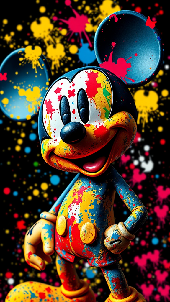 Vivid reinterpretation of Mickey Mouse with a Jackson Pollock-inspired splash of dynamic colors, capturing an abstract and wild emotional essence suitable for a MoMA magazine showcase. A fusion of high art and impressionism, utilizing a 3D model crafted in Maya, featuring a color-splattered face and body with high-resolution texture, reflecting professional photography. Award-winning artwork with a full image explosion in 4k, blending the iconic with the avant-garde, each element breathing in a Pixabay-worthy vision.
