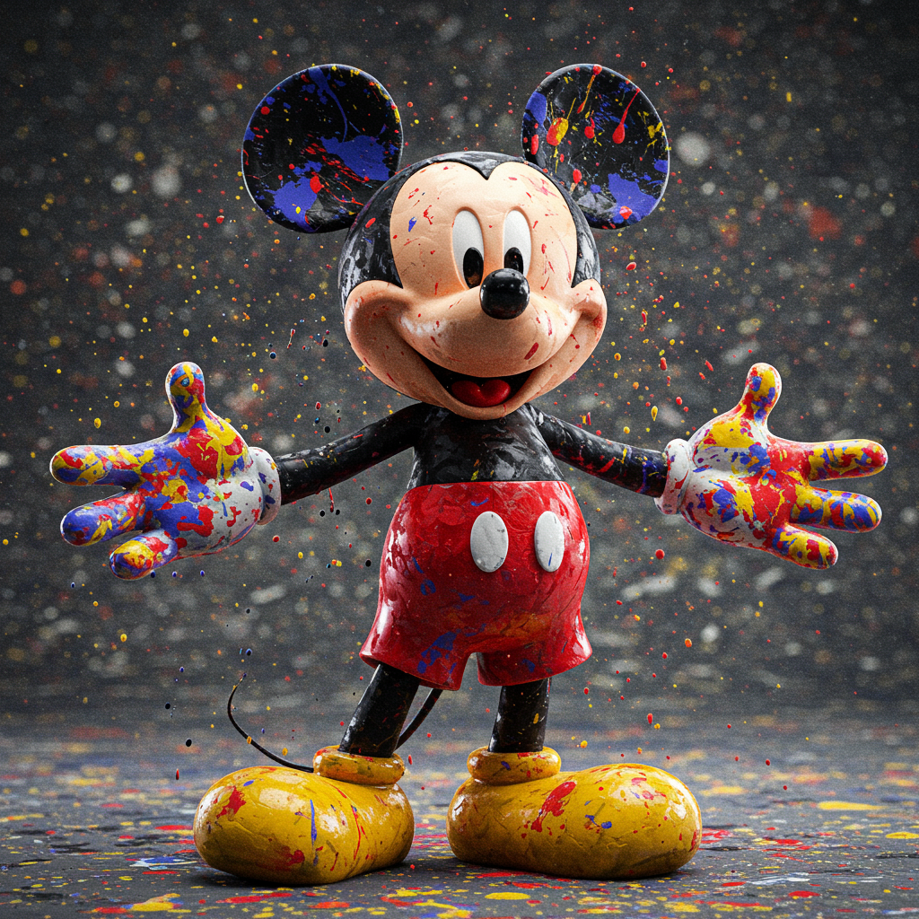 Vivid reinterpretation of Mickey Mouse with dynamic splashes of color, reminiscent of Jackson Pollock’s technique, set against a frenetic, expressive backdrop. This captivating piece, ideal for featuring in MoMA magazine, blends the wild and emotional essence of high art with elements of impressionism. Crafted as a 3D model using Maya, the artwork showcases Mickey’s face and body adorned with exuberant color spatters, presented with high-resolution texture. Captured in 4K, this professionally photographed, award-winning creation embodies the spirit of contemporary artistic innovation.