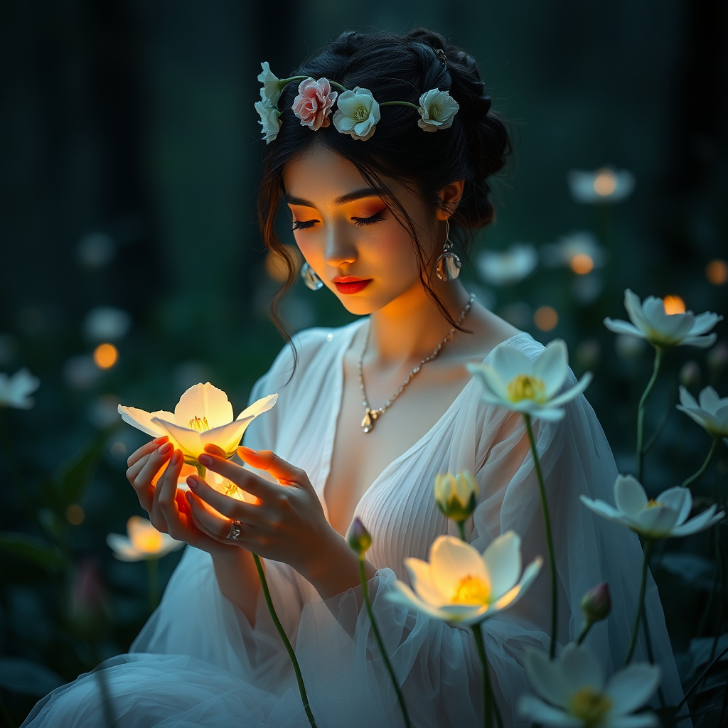 Vivid spring goddess emanates ethereal essence in forest of nocturnal dreams, delicately gathering enigmatic moonflowers under soft focus misty dawn, recall clashes with rare verdure landscape, poignant as nostalgia amidst tenderly blurred tiny droplets on succulent petals, shot with Hasselblad H4D 200MS -9 digital camera, serene, glowing epic light, harmonied within poetic 16x9 aspect ratio, classic bleach bypass aesthetic and tactile toning embrace dramatic dynamic range, entirely in minor key