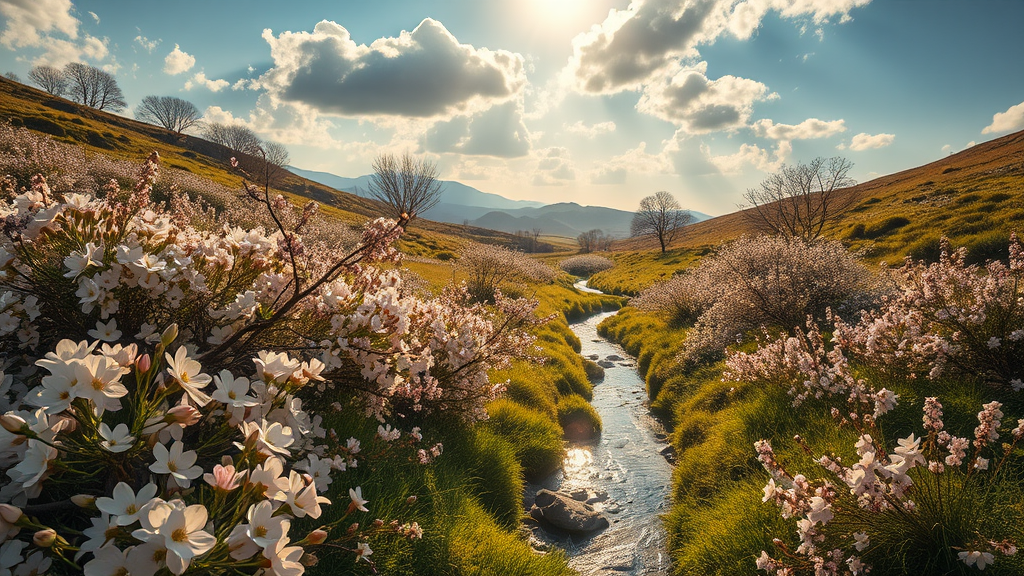Vivid spring scenery, cinematic ambiance, ultra-high-definition, intricate and lifelike, rendered in octane, featuring a tapestry of blooming flowers under expansive skies, infused with soft cream tones, gentle sunlight casting warm highlights, a tranquil stream winding through the landscape, adding a dynamic element to the serene setting.
