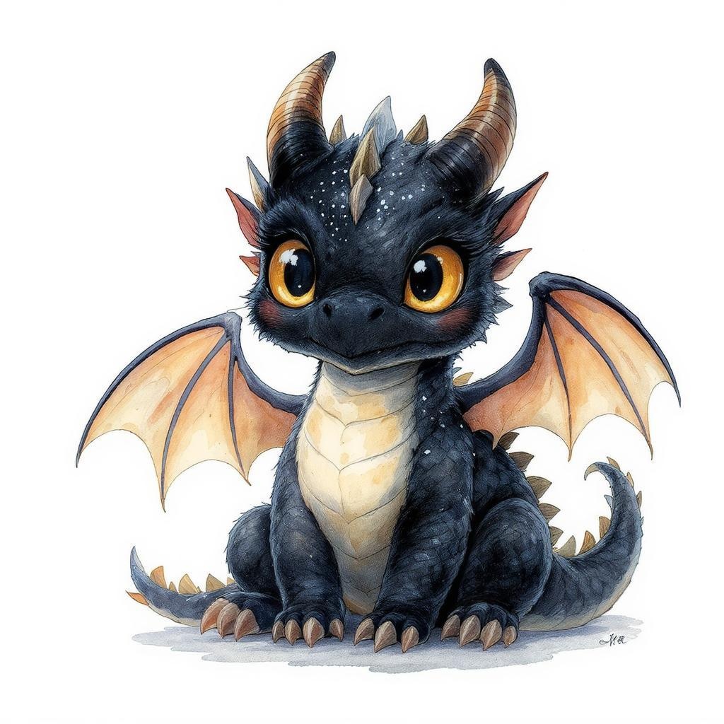 Vividly detailed illustration of an adorable black baby dragon, featuring large, expressive amber eyes and delicate wings, set against a pristine white backdrop. The artwork is rendered in a whimsical and intricate watercolor style, enriched with ornamental shading. The vibrant hues and subtle gradients give the piece a strikingly unique appearance, lending an enchanting aura to the dark-themed design.