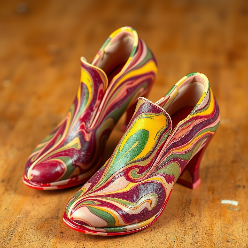 Vividly surreal footwear crafted from raw meat, designed with a vibrant splash of colors reminiscent of avant-garde food photography, each shoe showcasing intricate marbling and textures that evoke a fusion of culinary art and fashion fantasy.