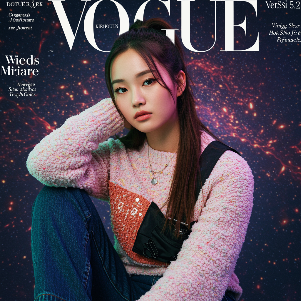 Vogue Magazine Cover, candid pose wearing trendy attire, studio photoshoot, enhanced lighting, imaginative psychedelic aesthetic backdrop, contemporary style, Version 5.2, creative adjustments incorporated.