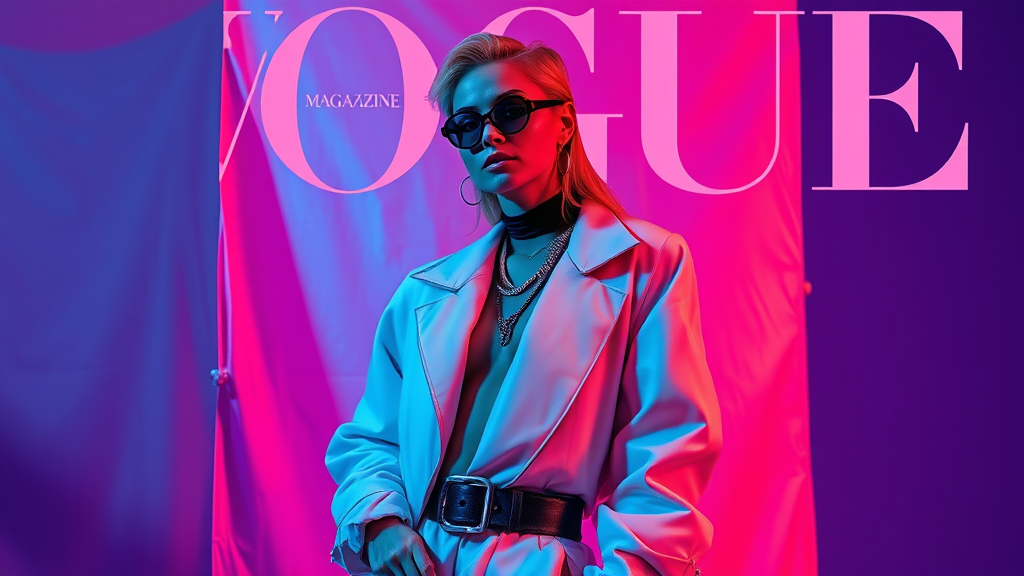 Vogue Magazine Cover, featuring a candid pose in avant-garde attire, magazine photoshoot, enhanced with studio lighting, vibrant and surreal aesthetic background, contemporary style, --v 5.2.