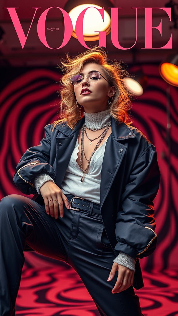 Vogue Magazine Cover featuring a candid pose, styled in a modern outfit, captured in a dynamic photoshoot. The setting includes studio lighting with a creative, psychedelic background. The look balances contemporary fashion with an avant-garde twist, showcasing a blend of vibrant colors and striking compositions.