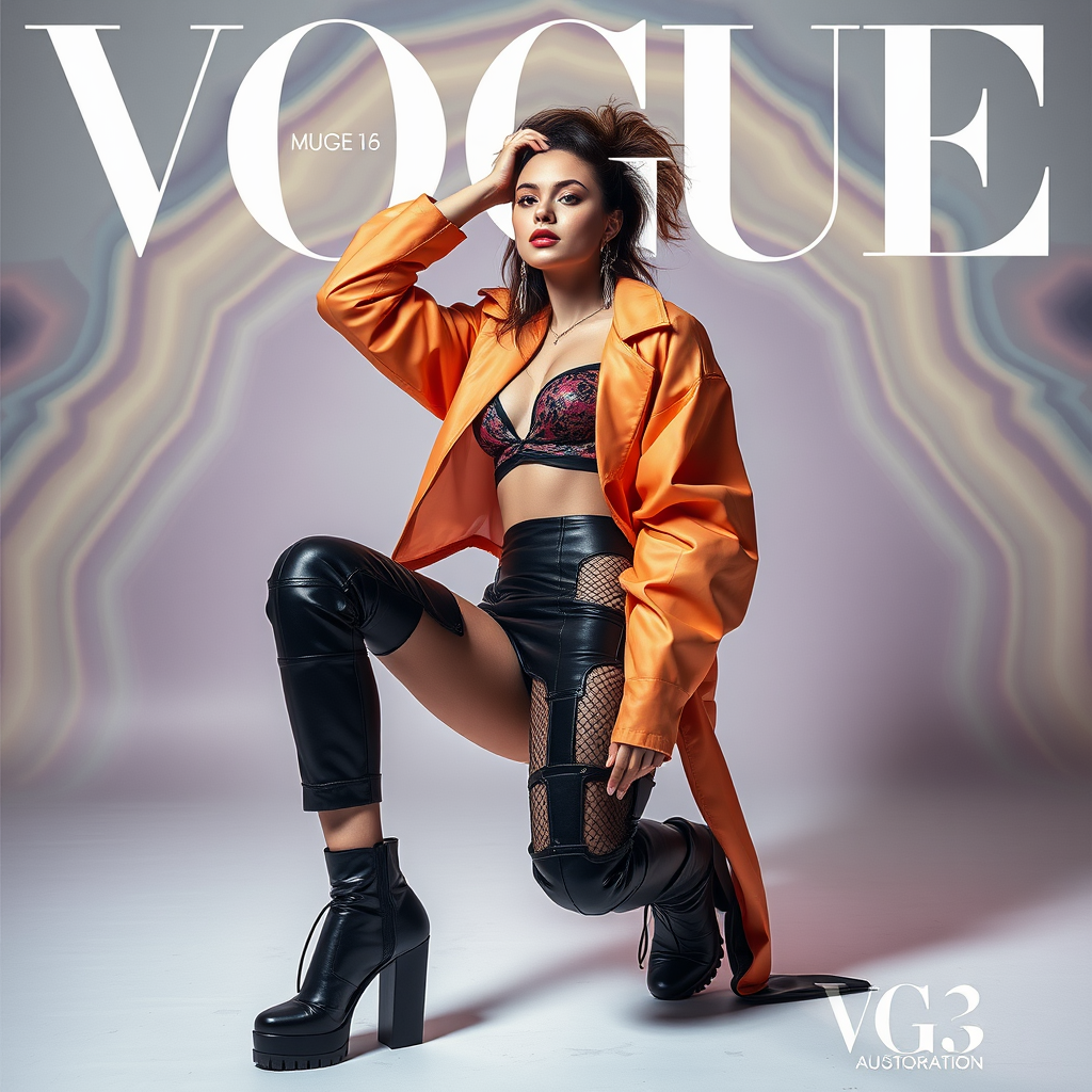 Vogue Magazine Cover, model striking a relaxed pose in avant-garde attire, studio photoshoot, dramatic lighting, innovative psychedelic background, contemporary fashion sense --v 5.2